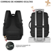 Cuenta con correas de hombro acolchadas y ocultas, permitiendo usarla como mochila tradicional o llevarla como bolso estilo maleta. Su panel trasero está reforzado con malla respirable para reducir el calor y mejorar la ventilación.